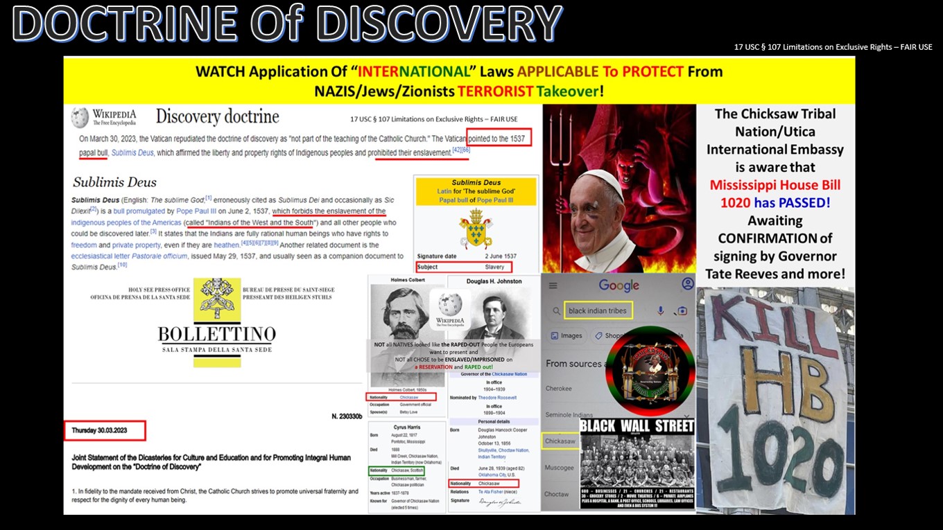 It appears, according to the Catholic Church’s “DOCRINE Of DISCOVERY,” CONSPIRACIES have been in motion for OVER 500+ Years – i.e. CONSPIRACIES to UNLAWFULLY invade Native Nations (as BLACK Indian Nations within what is presently known as the United States of America, Islamic Republic of Iran, Bolivarian Republic of Venezuela and Continent of Africa / Afrika, etc.) in QUESTS of the West’s / European Nations’ NAZI / White Supremacist / Ku Klux Klan / Jewish / Zionist Officials to “Have Their OWN World!”